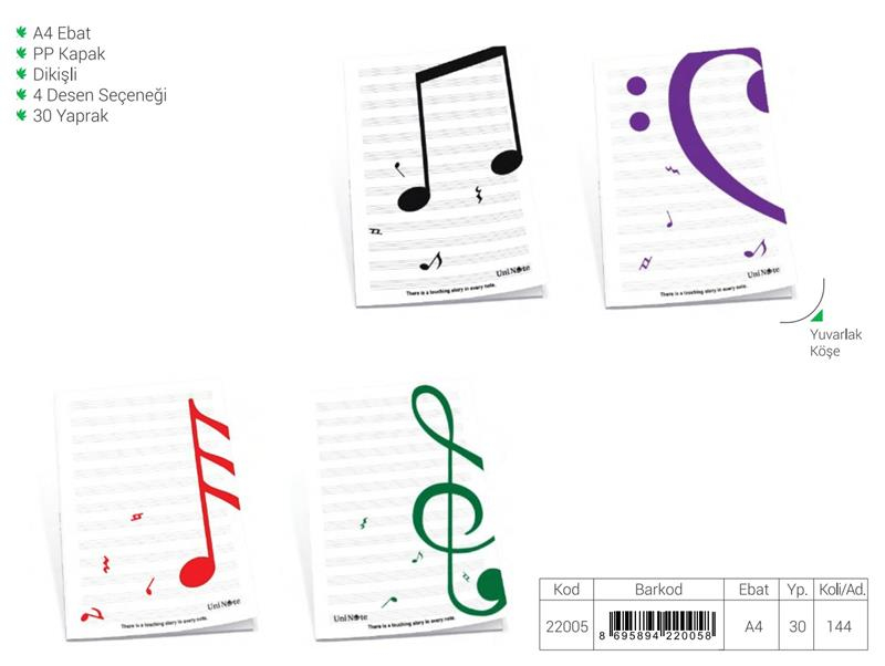 Çınar PP Kapak A4 Dikişli 30 Yaprak Müzik Defteri 12'li Paket