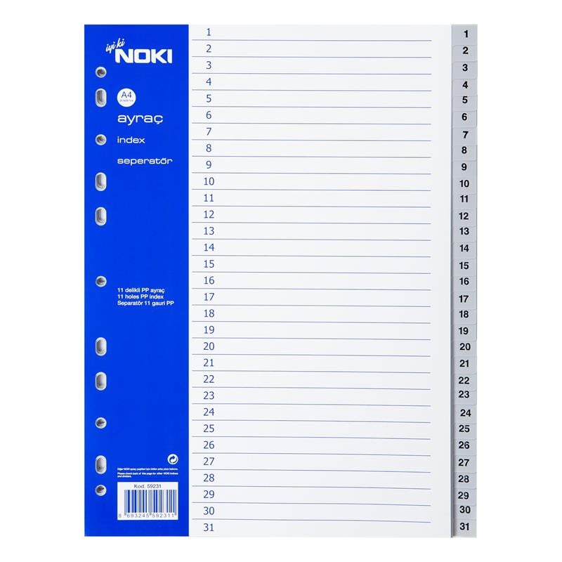 Noki 59231 1-31 Rakam Ayraç Özellikleri Ürün Özellikleri: *31 Rakamlı seperatör *Dayanıklı polipropilen malzeme *A4 boyutundaki evraklara uyumlu *Tüm klasörlere uyumlu *Çevreci Malzeme 1’ den 31’ e rakamlandırılmış kenarlıkları sayesinde arşivlemek veya sınıflandırmak istediğiniz A4 ebatlarındaki her tür belgeyi kolayca ve istediğiniz zaman bulmanıza yardımcı olan bu ürün estetik açıdan sunduğu ayrıcalıkla da sizi ve ofislerinizi olası dağınıklıklardan kurtarıyor. Dayanıklı klasör delikleri, rakamlı göstergeleri ve sağlığa zararlı maddeler içermeyen ısıya, neme, kimyasala dayanıklı polipropilen yapısı uzun yıllar arşiv ve ofis alanlarınızda kullanıma olanak tanır. Sol tarafta bulunan 11 klasör deliği sayesinde her klasöre uyum sağlar. Evrak, fatura, personel ve şirket bilgileri gibi ayrıntıları gün, ay, önem sırası gibi başlıklarda rakamlı göstergeleri sayesinde kolayca arşivleyebilirsiniz. Öğrencilerimize düzen kazandırmayı kolaylaştıracak, çalışan her bireye z