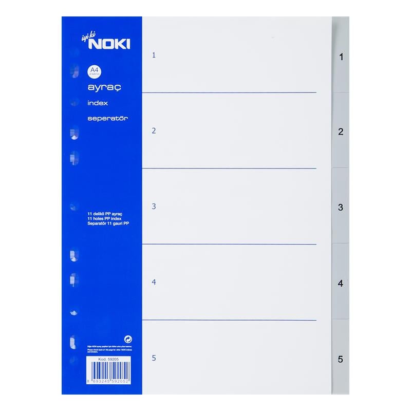 Noki 59205 1-5 Rakam Ayraç Özellikleri Ürün Özellikleri: *1-5 rakam seperatör *Dayanıklı polipropilen malzeme *A4 boyutundaki evraklara uyumlu *11 delik, tüm klasörlere uyumlu *Sağlığa zararlı maddeler içermez Farklı renklerde kenarlıkları sayesinde arşivlemek veya sınıflandırmak istediğiniz A4 ebatlarındaki her tür belgeyi kolayca ve istediğiniz zaman bulmanıza yardımcı olan bu ürün estetik açıdan sunduğu ayrıcalıkla da sizi ve ofislerinizi durağanlıktan kurtarıyor. Sağlam klasör delikleri, renkli göstergeleri ve sağlığa zararlı maddeler içermeyen ısıya, neme, kimyasala dayanıklı polipropilen yapısı uzun yıllar arşiv ve ofis alanlarınızda kullanıma olanak tanır. Sol tarafta bulunan 11 klasör deliği sayesinde her klasöre uyum sağlar. Evrak, fatura, personel ve şirket bilgileri gibi ayrıntıları gün, ay, önem sırası gibi başlıklarda renkli göstergeleri sayesinde kolayca arşivleyebilirsiniz.