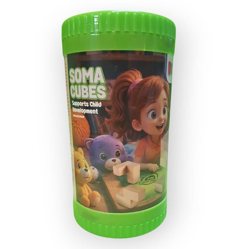 Birbiri ile farklı yönlerde bağlanmış “dört birim küplü 6 parça” ve “üç birim küplü 1 parça” olmak üzere toplam 7 parçadan oluşan Soma Küp’te amaç 3x3x3 birim küpten oluşmuş bir büyük küpü meydana getirmektir. Bu parçalar ile birçok farklı geometrik şekil elde edilebilir. Soma Küpleri, düzensiz şekillerden düzenli şekiller elde etmek için kullanılır. KUMAŞ TAŞIMA ÇANTASI İÇERİSİNDEDİR 23 CM YÜKSEKLİK 13 CM ÇAPINDA PLASTİK KUTUDA