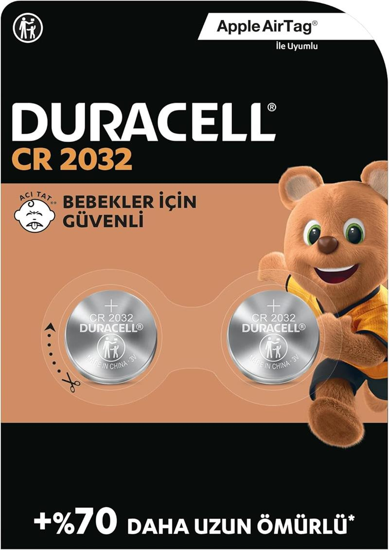 Duracell CR2032 Lityum Düğme Piller (2’li Paket) 3V - %70’e Kadar Daha Uzun Ömür - Bebek Güvenlik Teknolojisi ve Bebek Güvenlikli Paketleme – Apple AirTag, Fitness ve Tıbbi Aksesuarlarda Kullanım