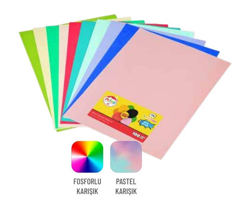 Renkli Fotokopi Kağıdı - 80 gr Pastel ve Fosforlu 10 Renk Karışık A4 100’lü Pk. Colored Photocopy Paper - 80 gr.-A4 - 100 packs - 10 Mixed Colors with Pastel and Highlight Renkli fotokopi kağıtları 80 gr/m² hamurundan boyamalı kağıt ile üretilmiştir. Hamurundan boyamalı olduğu için sararmaz, rengi elinize bulaşmaz ve elişi derslerine uygundur.Çocuklar için güvenlidir. Colored photocopy paper is made from 80 gsm dyed pulp paper. Since it is dyed in the pulp, it does not yellow over time, the color does not transfer to hands, and it is suitable for craft lessons. Safe for children.